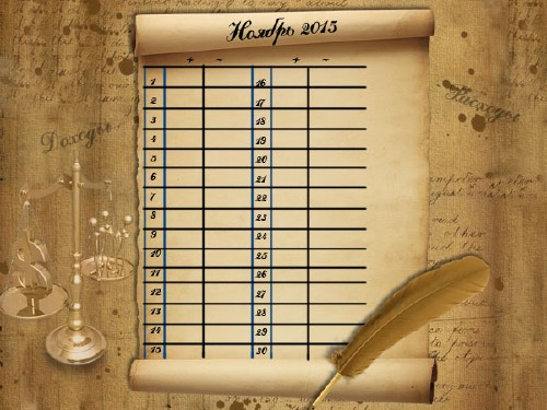 Календарь на ноябрь - Мой бюджет ?Если вы задумывались о том, куда же все таки у вас уходят деньги и сколько было потрачено за месяц, а сколько заработали? Тогда вам в помощь месячный календарь доходов и расходов на ноябрь 2015. PSD | 2000x1500 | 300 dpi | 22 Мб Автор: Alexey84