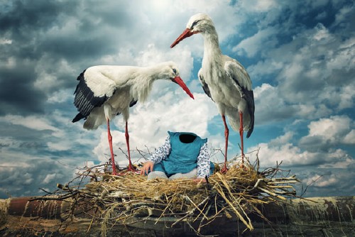 Креативный детский шаблон для фото, ребенок в гнезда с двумя красивыми аистами